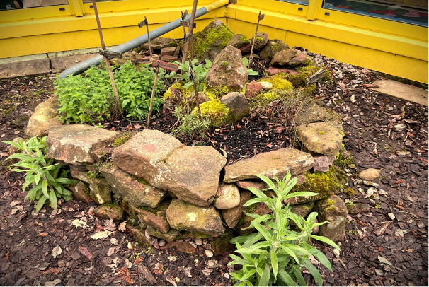 Das Außenspielgelände ist gegliedert durch eine große Sand- und Rasenfläche mit vielen Kletter- und Rutschmöglichkeiten. Mehrere Hecken, Büsche und Sträucher, sowie eine große sonnige Spielwiese hinter dem Haus bieten den Kindern viele Spiel- und Rückzugsmöglichkeiten. Ein spezieller Sinnesgarten ermöglicht Kindern Erfahrungen zu sammeln, die in unserer schnelllebigen Zeit oft in Vergessenheit geraten sind: das Barfußlaufen auf unterschiedlichem Boden, wie Sand, Kieselsteine, Rindenmulch, Holzscheiben sensibilisiert die Füße der Kinder und verbessert die taktielle Wahrnehmung. Zudem ist hier eine Kräuterecke eingerichtet.